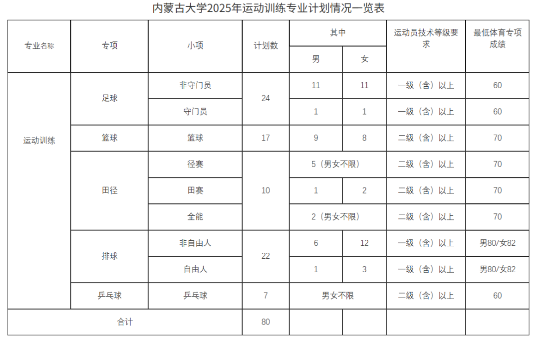根据上级有关文件精神,按照《内蒙古大学2025年运动训练专业招生简章》规定,考生在文化成绩不低于180分,体育专项成绩满足所报项目要求的基础上,按照折合百分制后文化成绩×30% 与体育专项成绩×70% 相加进行综合评价,按照项目招生计划数1:1的比例,依据综合分由高到低择优录取(综合分计算时四舍五入保留小数点后两位)。
