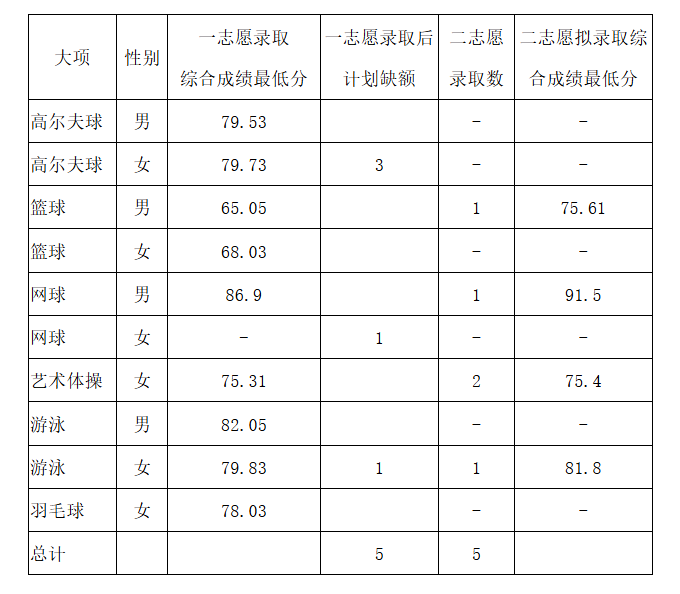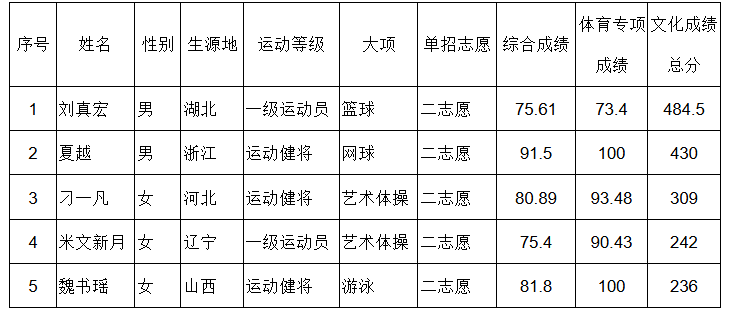 二、二志愿拟录取名单,共5人,具体如下。 最终录取结果以国家体育总局和各省、市、自治区考试院审核为准。