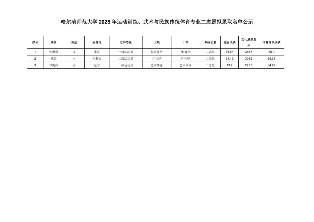 哈尔滨师范大学2025年运动训练、武术与民族传统体育专业二志愿拟录取考生名单公示