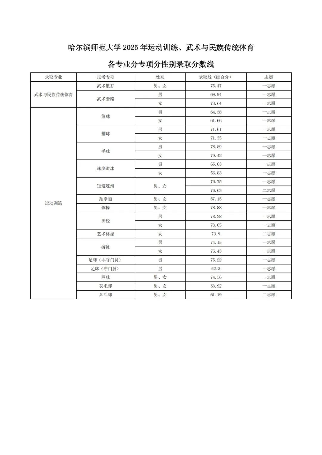 附件:哈尔滨师范大学2025年运动训练、武术与民族传统体育各专业分专项分性别录取分数线.pdf