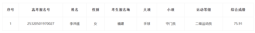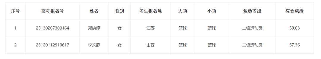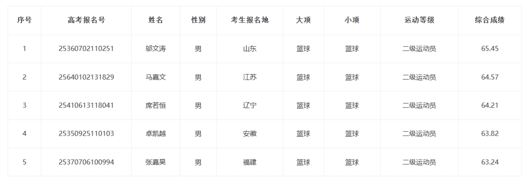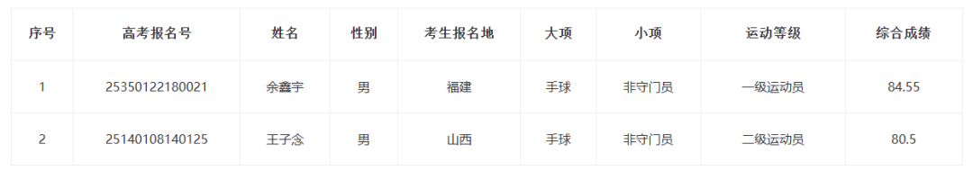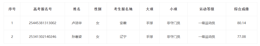 按照《体育总局办公厅 教育部办公厅关于印发<2025年普通高等学校运动训练、武术与民族传统体育专业招生管理办法>的通知》(体科字〔2024〕256号)及《辽宁工程技术大学2025年运动训练招生简章》录取相关规定,立足优化人才培养促进各项目代表队不断突破竞技体育成绩,考虑学校项目需求、组队需要,经学校本科生招生委员会研究,拟决定录取运动训练第二志愿考生12人,其中:手球(女,非守门员)2人、手球(女,守门员)1人、手球(男,非守门员)2人、篮球(女)2人、篮球(男)5人。现将拟录取第二志愿考生名单予以公示,正式录取名单以教育部、国家体育总局及各生源地省级招生部门审核通过为准。