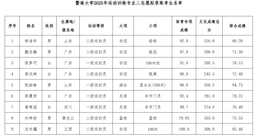 根据教育部和国家体育总局有关文件精神以及《暨南大学2025年运动训练专业招生简章》等规定,结合生源情况,我校确定了运动训练专业二志愿拟录取名单,共9人。