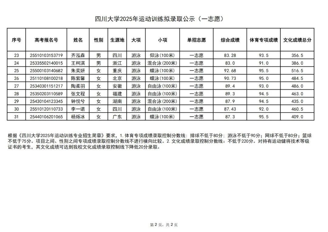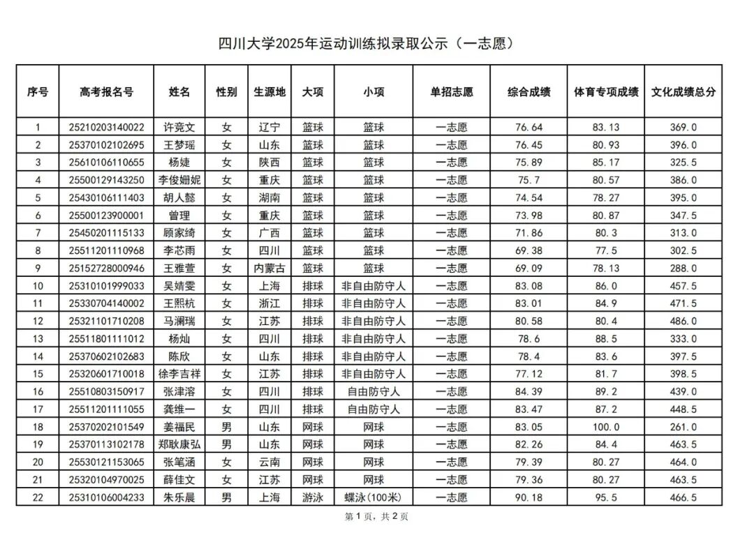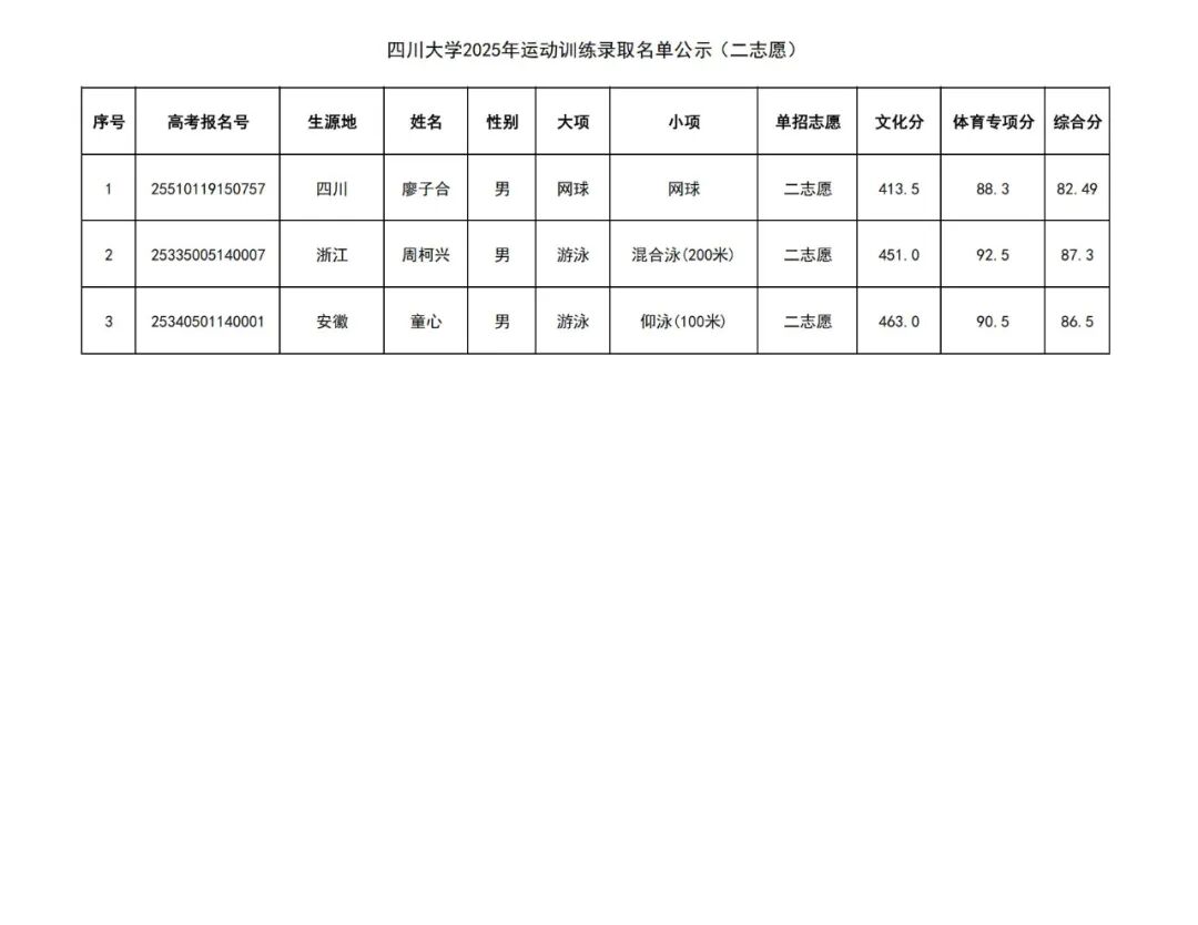 根据教育部文件和《四川大学2025年运动训练专业招生简章》的相关要求,我校确定一志愿和二志愿拟录取名单,现予以公示。考生若对公示名单有异议,请在公示有效期内反映。