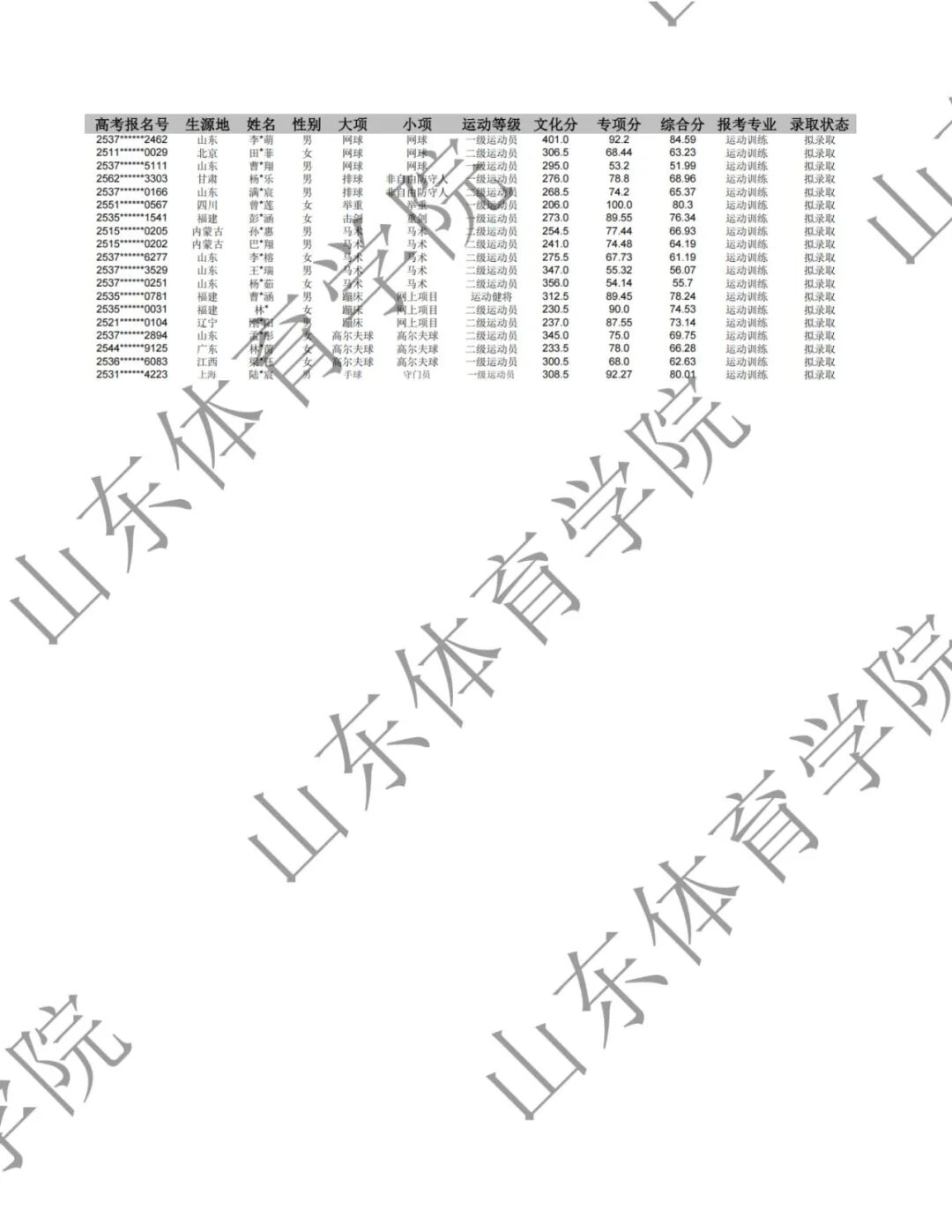 山东体育学院2025年体育单招拟录取名单(二志愿)