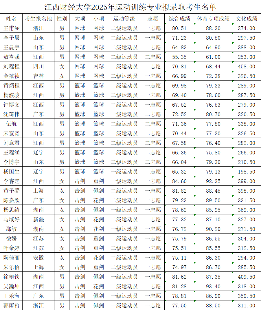 附件:江西财经大学2025年运动训练专业拟录取考生名单