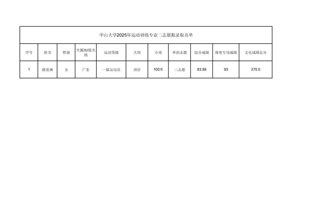 中山大学2025年运动训练专业二志愿拟录取名单公示
