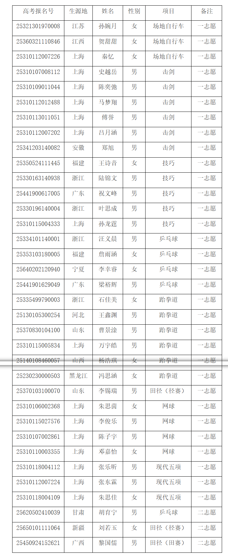 正式录取名单以教育部、国家体育总局及各省招生考试机构审核通过为准。