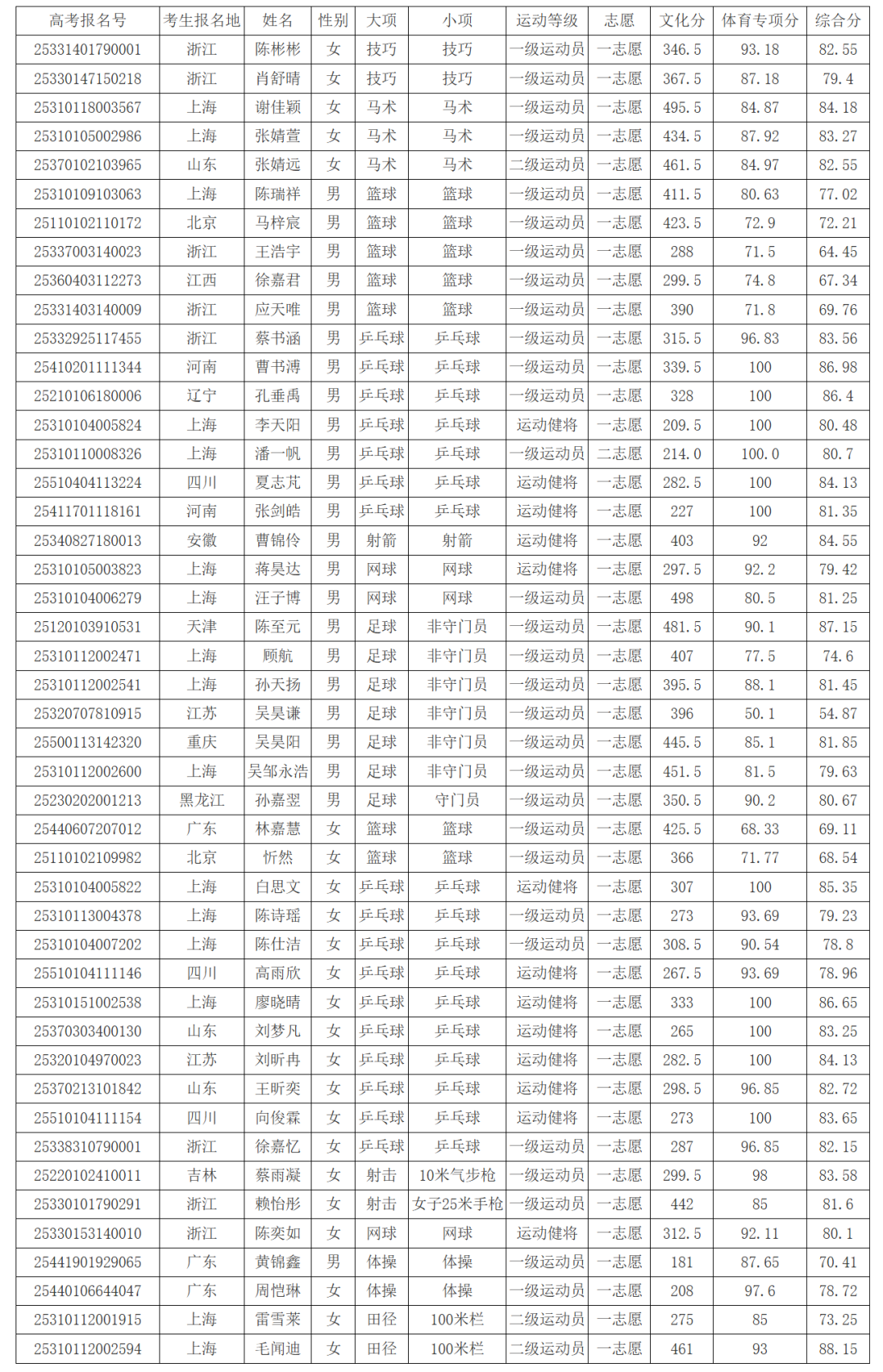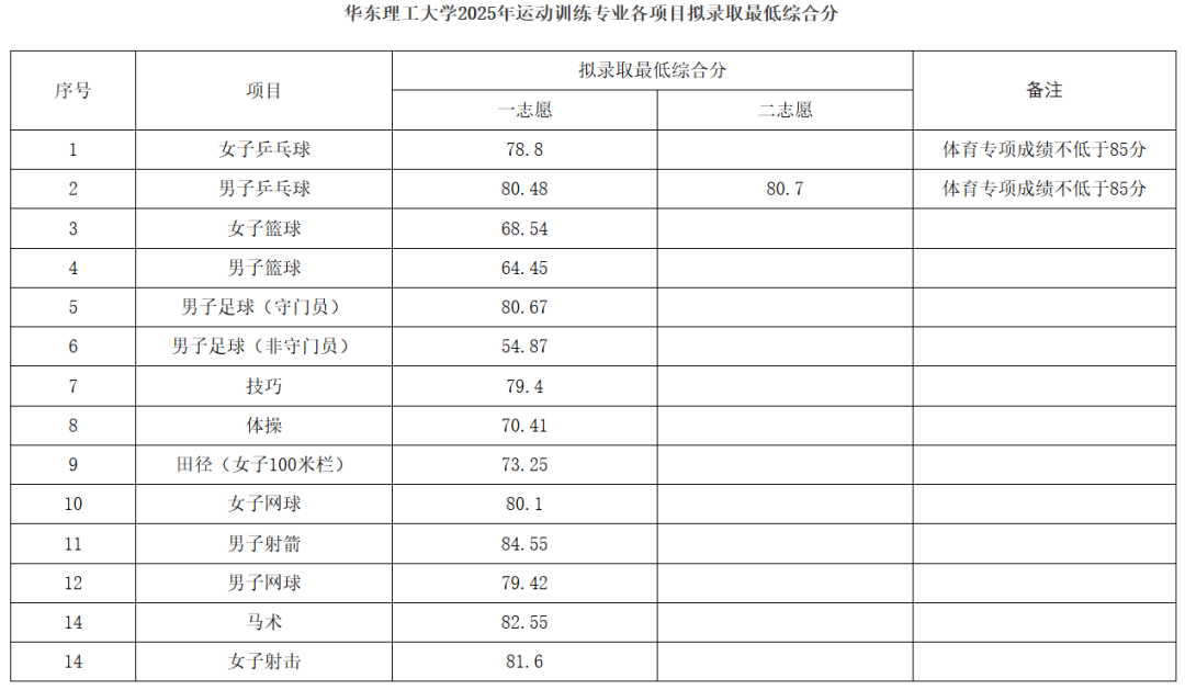 2025年运动训练专业拟录取最低综合分及拟录取名单公示