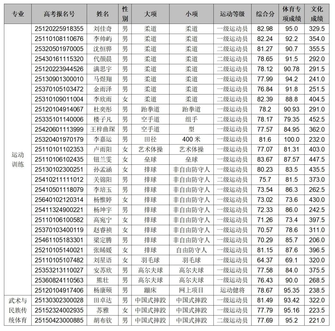 根据教育部、国家体育总局相关文件及《天津体育学院2025年运动训练、武术与民族传统体育专业招生简章》中公布的录取原则,经学校研究决定,现将我校2025年运动训练、武术与民族传统体育专业二志愿拟录取结果公示如下:
