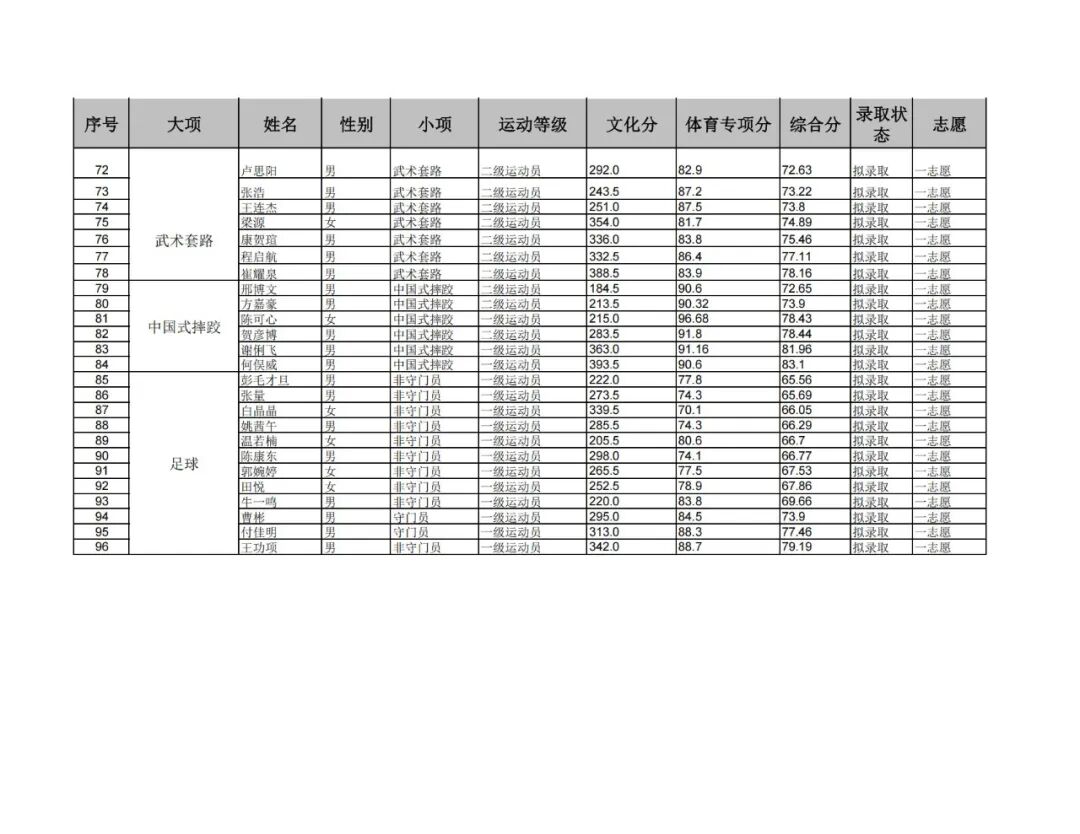 根据体育总局科教司、教育部高校学生司有关文件精神,依据《邯郸学院2025年运动训练、武术民族传统体育专业招生简章》,和《2025年邯郸学院运动训练、武术与民族传统体育专业分项目招生计划与录取办法》的规定,经学校招生工作领导小组研究,确定王功项等96名同学获得我校2025年运动训练、武术民族传统体育专业拟录取资格,现予以公示(详见附件)。