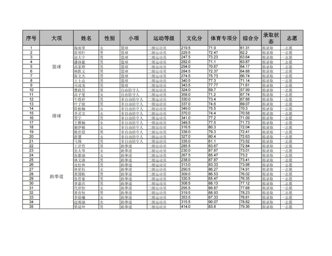 邯郸学院2025年体育单招拟录取名单(含二志愿)
