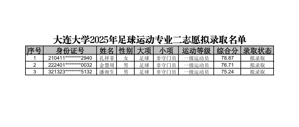 大连大学2025年足球运动专业二志愿拟录取名单公示