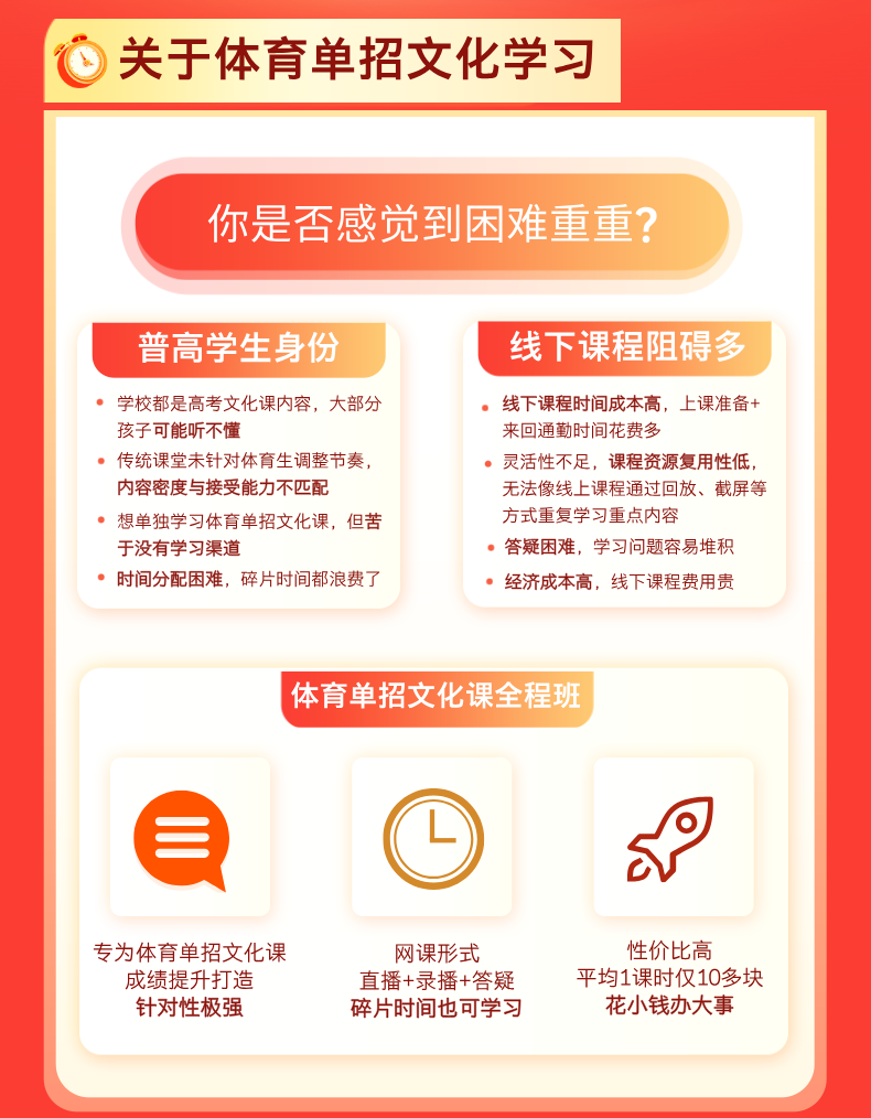 体育单招的路不算轻松,尤其是文化课,越来越成为拉分的关键。在时间紧、任务重的现实面前,如何科学备考、系统提分,成为每一位考生和家长最关心的问题。