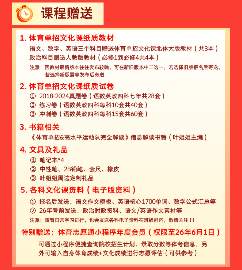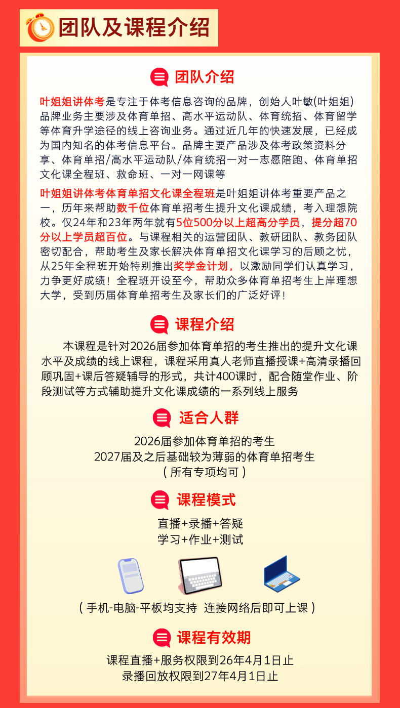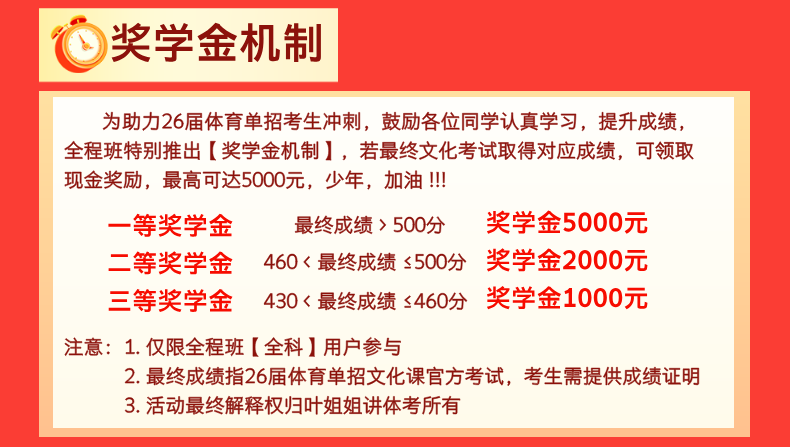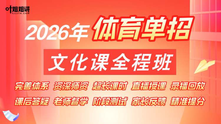 为此,叶姐姐讲体考2026届线上全程班全面升级,专为体育生量身打造文化课提升方案。由专业教师团队带队,课程系统科学,紧扣考试重点,帮助学生稳步提分、打牢基础,为明年顺利上岸打下坚实根基。