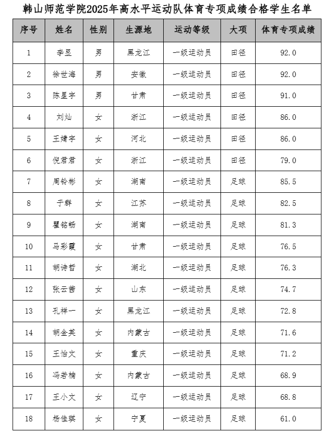 韩山师范学院2025年高水平运动队体育专项成绩合格学生名单的公示