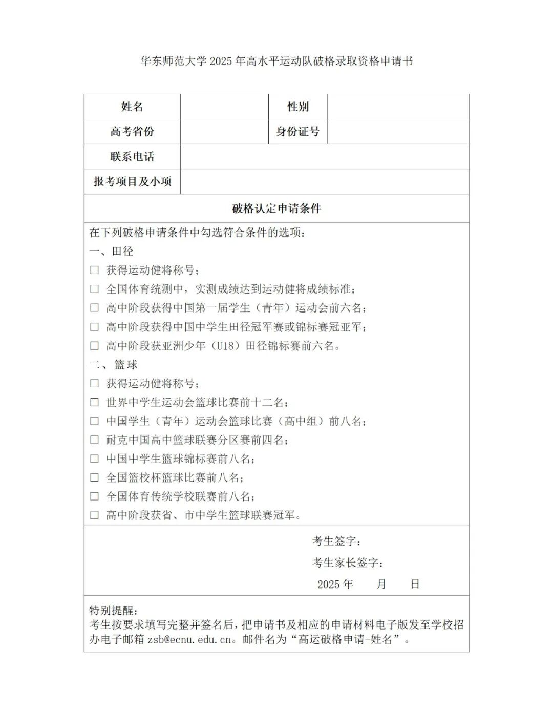 华东师范大学2025年高水平运动队破格录取资格申请书.docx
