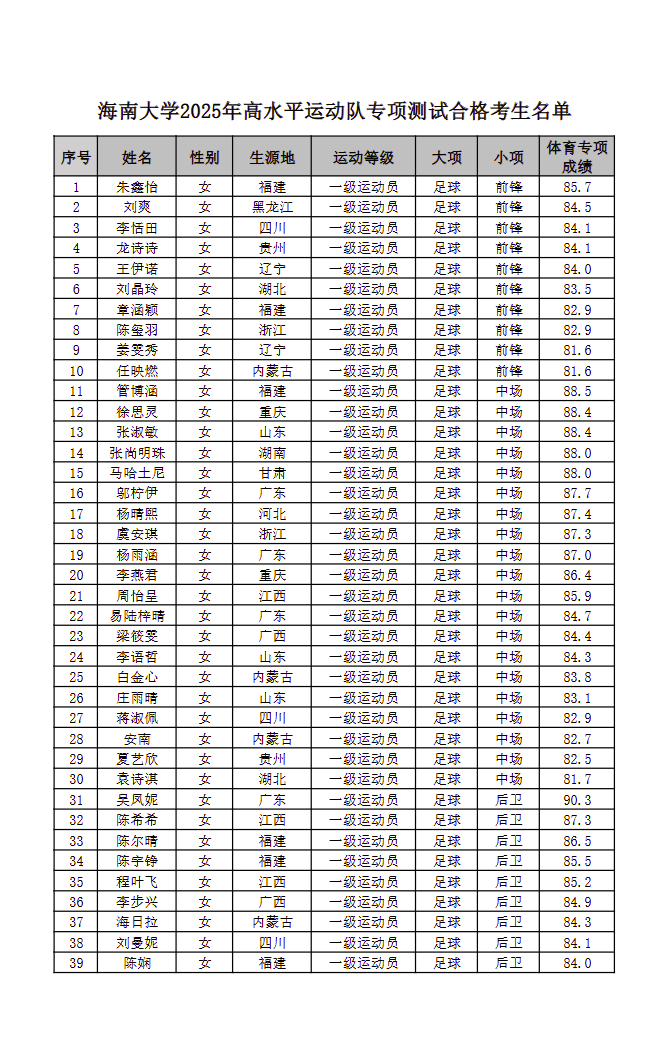 根据教育部办公厅《关于做好2025年普通高等学校部分特殊类型招生工作的通知》(教学厅〔2024〕7号)和《海南大学2025年高水平运动队招生简章》相关规定,结合学校高水平运动队建设需要和考生体育专项测试成绩结果,按照择优录取、宁缺毋滥的原则,现将我校高水平运动队招生专项足球项目(女足)合格考生名单进行公示,公示时间:即日起至6月6日中午12时(对结果存在疑问者,请于公示期内提出,逾期不予受理)。联系电话:0898-66266469(海南大学招生考试中心),邮箱:zsks@hainanu.edu.cn。