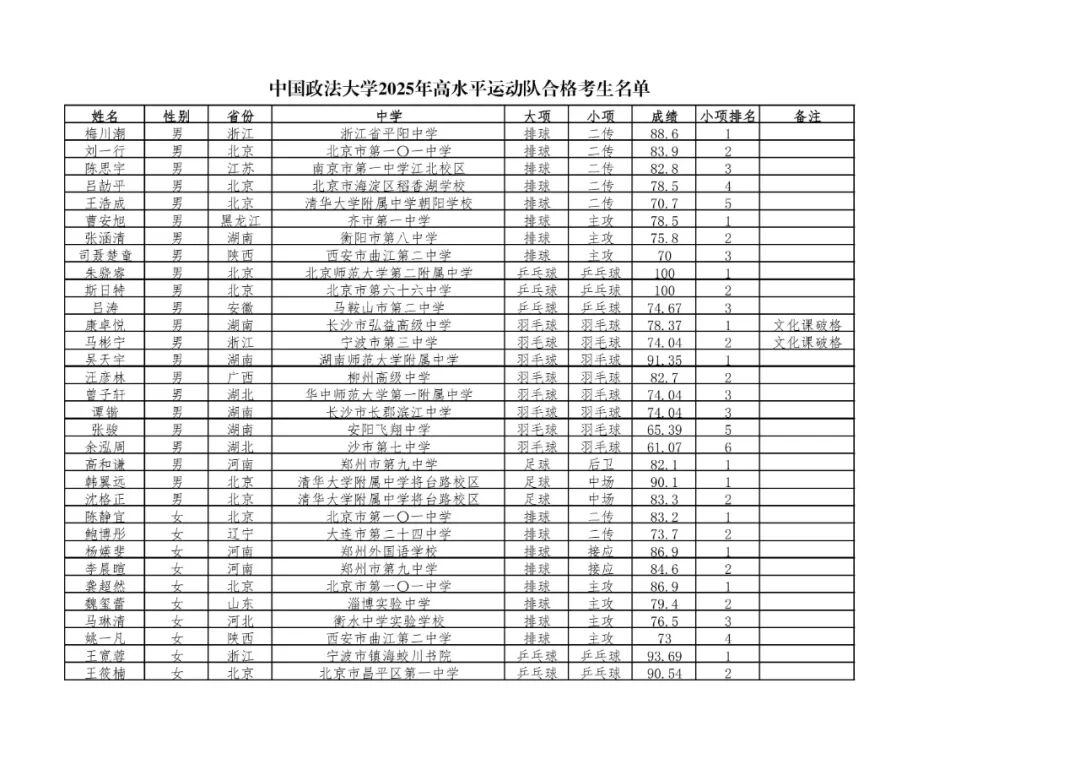 中国政法大学2025年高水平运动队招生合格名单公示