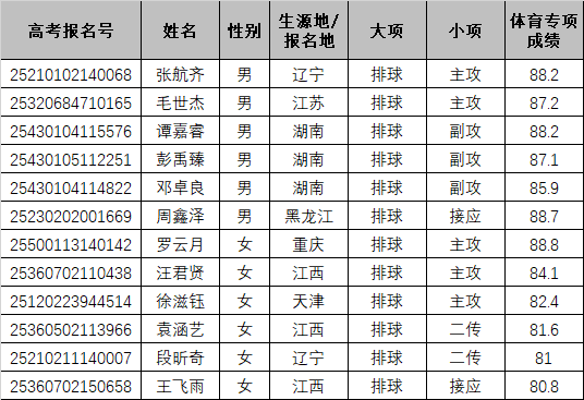 根据《教育部办公厅关于做好2025年普通高等学校部分特殊类型招生工作的通知》(教学厅〔2024〕7号)和《湖南师范大学2025年高水平运动队招生简章》规定,学校结合体育单招录取结果、专业测试成绩,择优确定我校2025年高水平运动队合格考生名单。现公示如下: