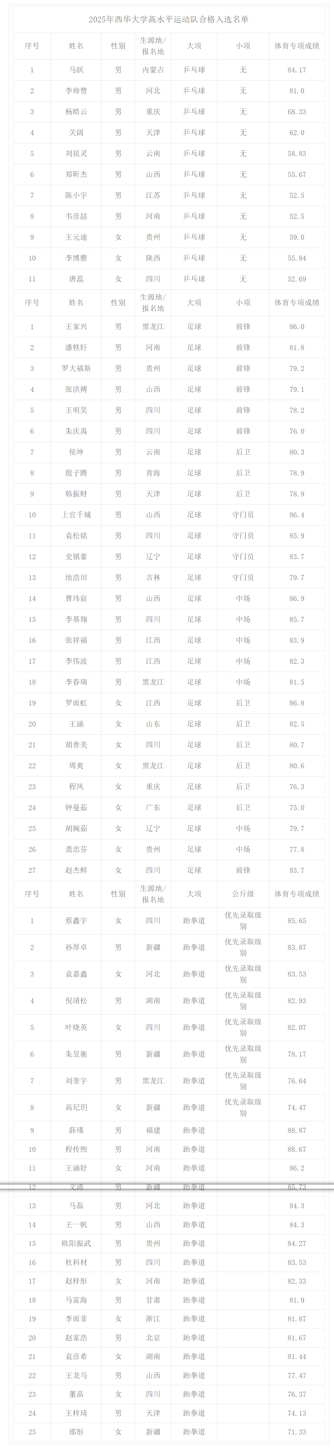 根据教育部办公厅《关于做好2025年普通高等学校部分特殊类型招生工作的通知》(教学厅〔2024〕7号)和《西华大学2025年高水平运动队招生简章》相关规定,结合学校高水平运动队建设需要,学校拟定2025年高水平运动队专项成绩合格名单,经学校本科招生领导小组审议后现予以公示,名单附后。