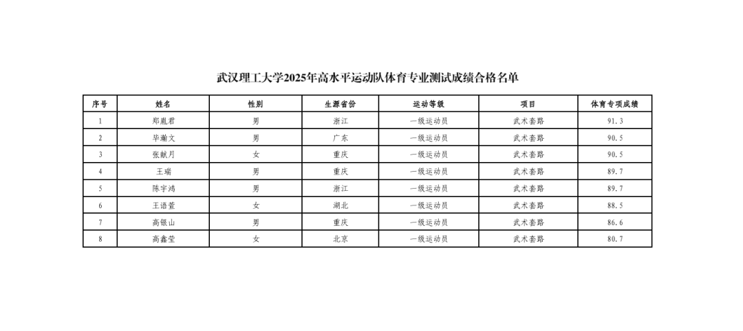 根据教育部有关文件精神及《武汉理工大学2025年高水平运动队招生简章》,结合高水平运动队报名资格审核结果、体育单招录取结果等,学校确定了2025年高水平运动队武术套路的体育专业测试成绩合格名单(见附件),现予以公示。