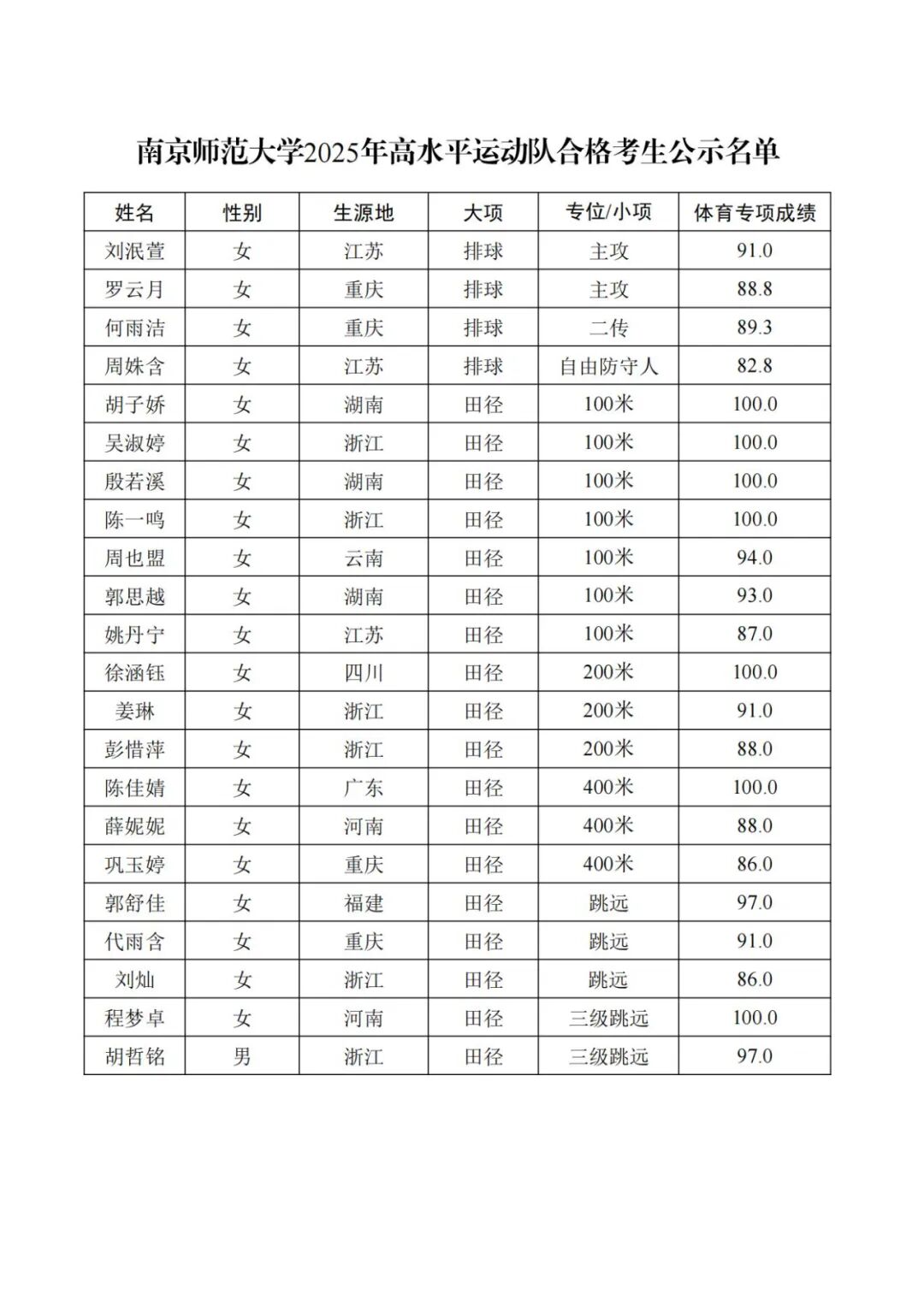 根据国家体育总局、教育部有关文件及《南京师范大学2025年高水平运动队招生简章》,结合考生体育单招录取结果、体育专项成绩、我校高水平运动队组队需要和招生计划。经研究,拟分项目确定以下22名2025年高水平运动队合格名单(详见附件),现予以公示。公示时间为6月6日至6月13日。