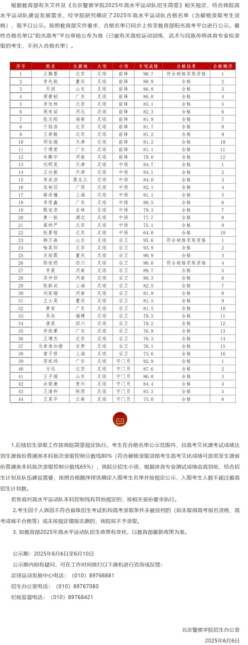 北京警察学院2025年高水平运动队合格名单公示