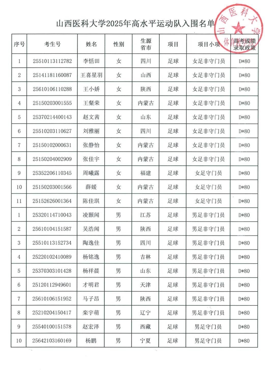 山西医科大学关于2025年高水平运动队入围名单的公示