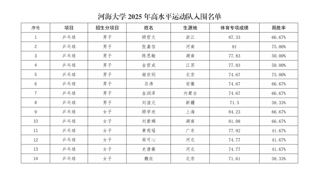 根据教育部有关文件和《河海大学2025年高水平运动队招生简章》相关要求,14位考生获得我校2025年高水平运动队入围资格。