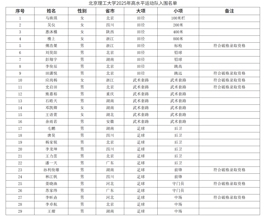 根据教育部有关文件及《北京理工大学2025年高水平运动队招生简章》相关规定,结合我校招生计划及高水平运动队建设发展需求,经学校研究确定了我校2025年高水平运动队入围名单,现予以公示(详见附件)。入围名单已同步上传至教育部阳光高考平台进行公示(http://gaokao.chsi.com.cn),最终名单以“阳光高考”平台审核公布为准。