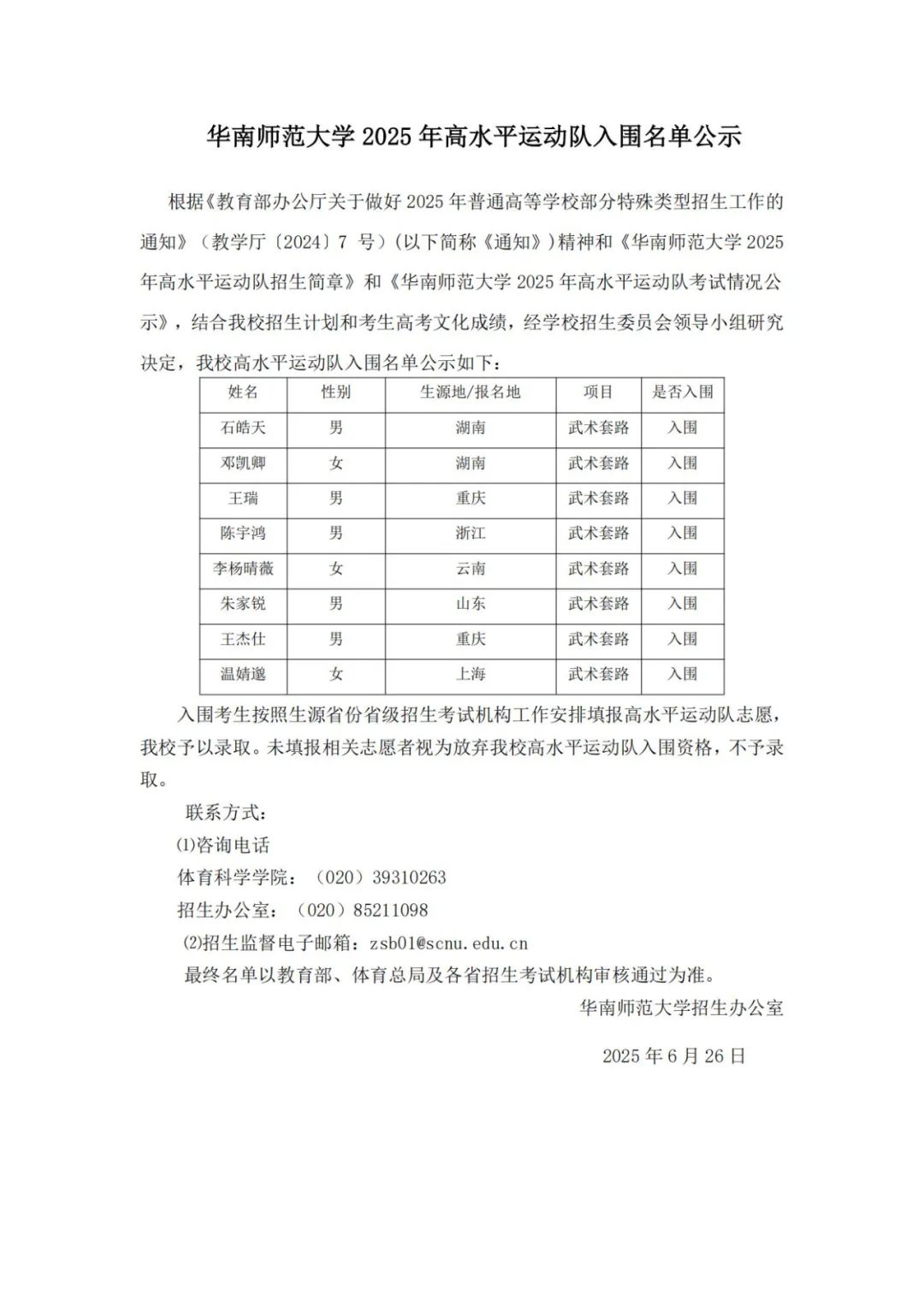 华南师范大学2025年高水平运动队入围名单公示