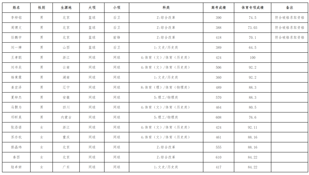 注:入围考生须按照生源地省级招生考试机构工作安排填报我校高水平运动队志愿。考生因未填报高考志愿或不符合省级招生考试机构高考录取条件未被投档的,我校不予录取。