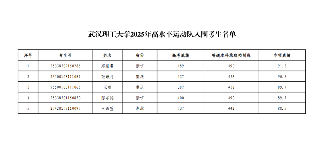 根据教育部有关文件精神及《武汉理工大学2025年高水平运动队招生简章》,结合学校2025年高水平运动队体育专业测试成绩合格名单和考生的高考文化课成绩,学校确定了2025年高水平运动队入围考生名单(见附件),现予以公示。