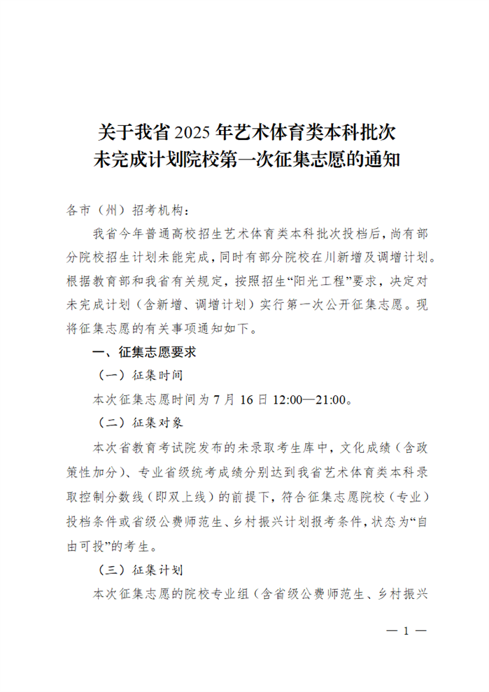 关于四川省2025年艺术体育类本科批次未完成计划院校第一次征集志愿的通知(仅展示体育类)