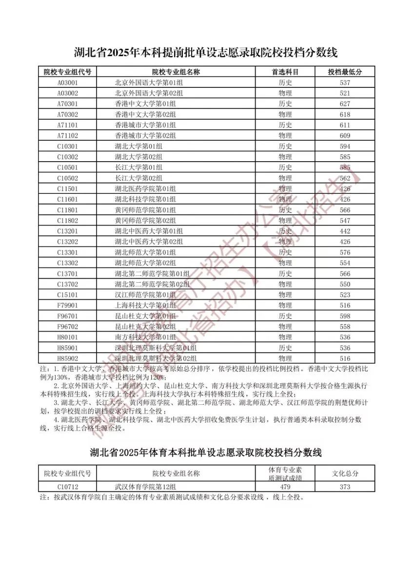 湖北省2025年本科提前批单设志愿、体育本科批单设志愿录取院校投档分数线