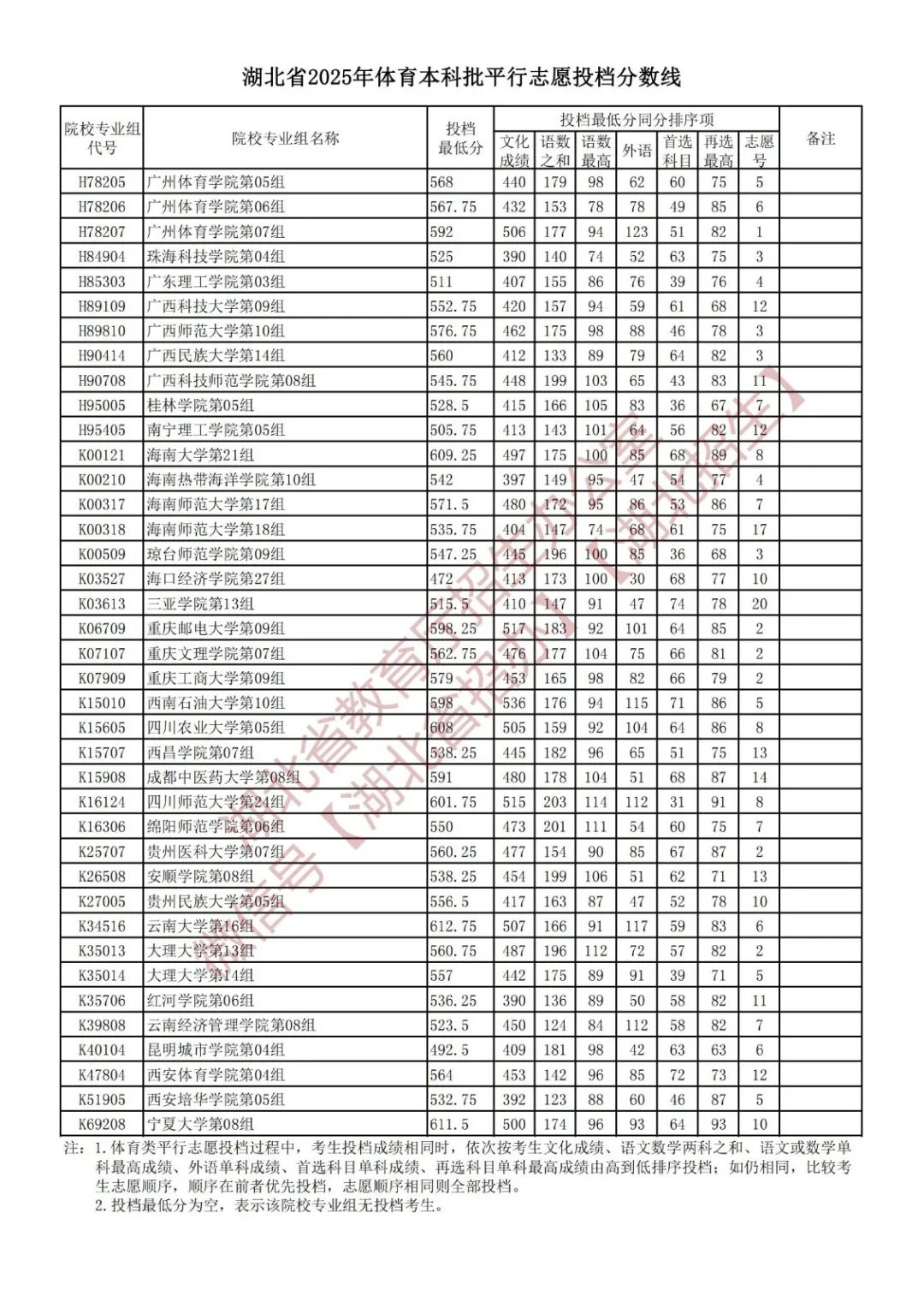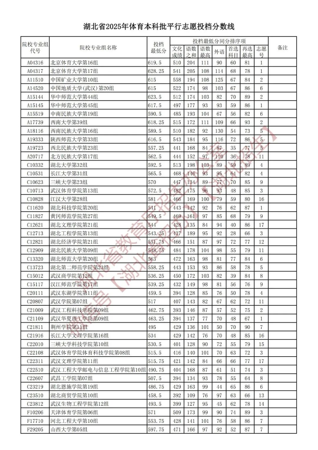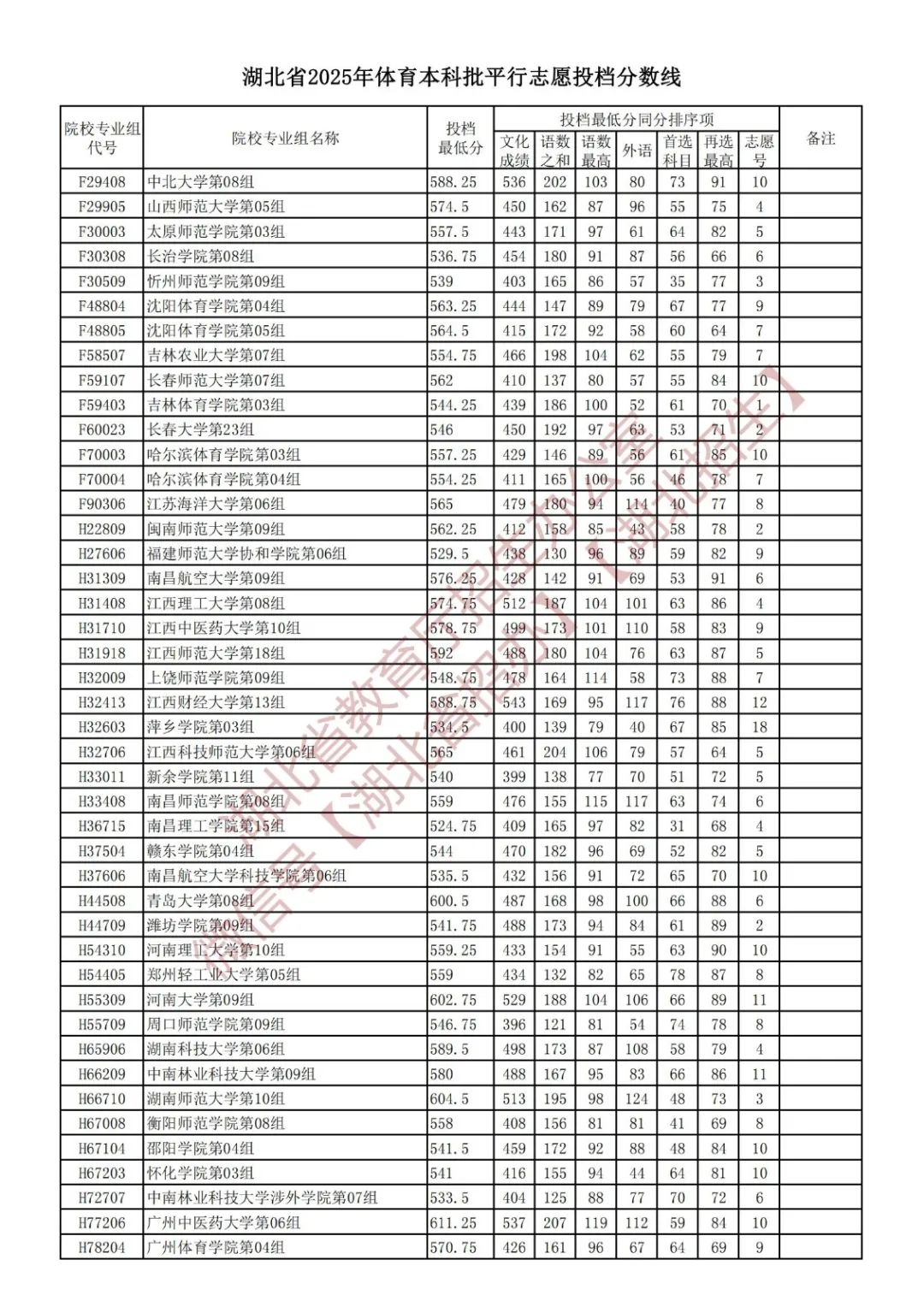 湖北省2025年体育本科批平行志愿投档分数线