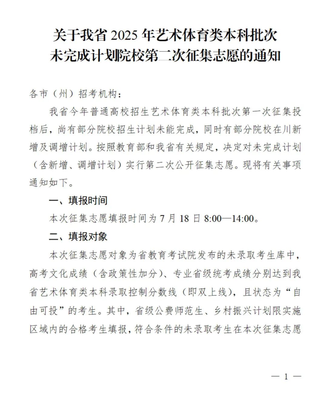关于四川省2025年艺术体育类本科批次未完成计划院校第二次征集志愿的通知