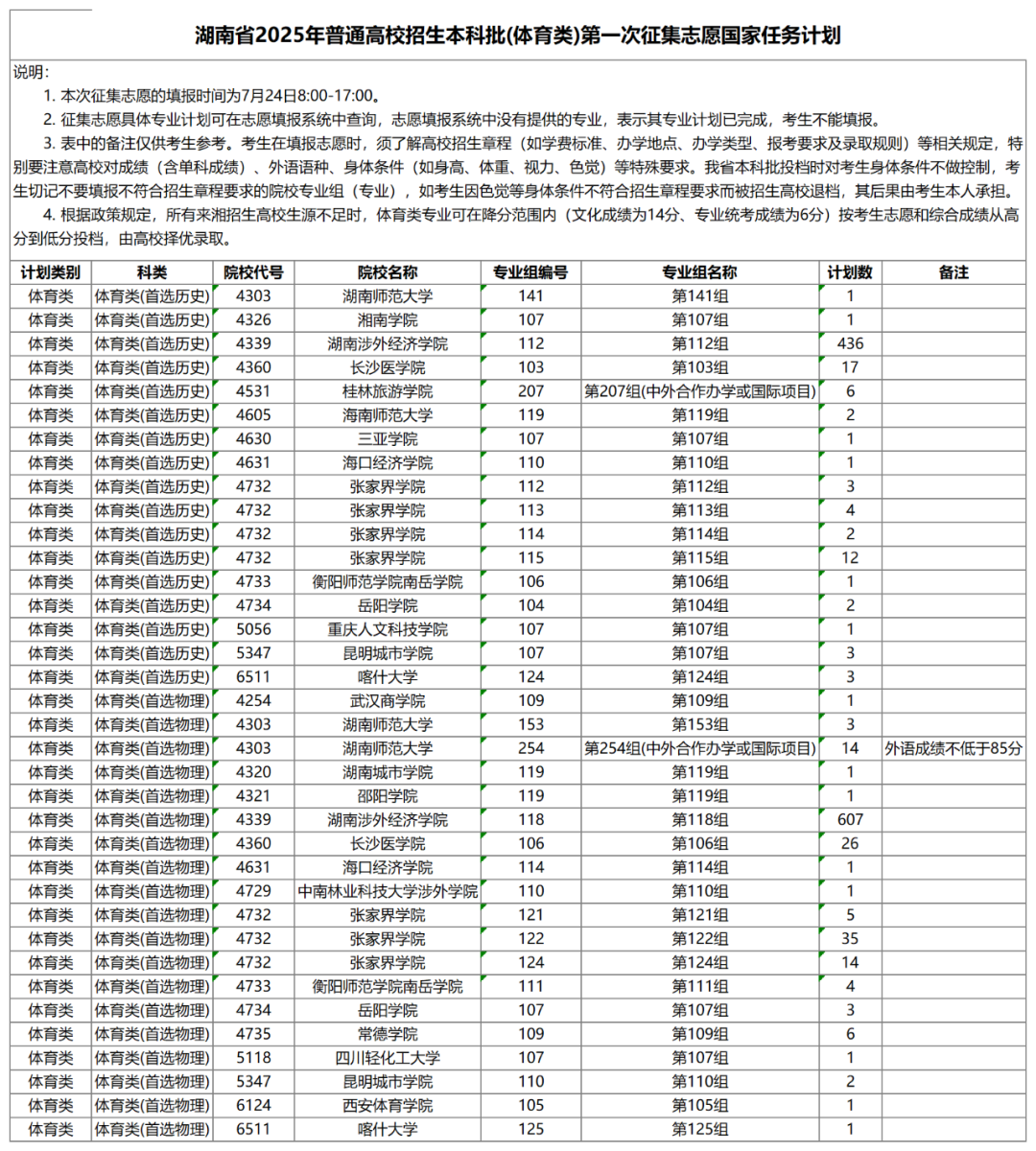 湖南省2025年普通高校招生本科批(体育类)第一次征集志愿国家任务计划