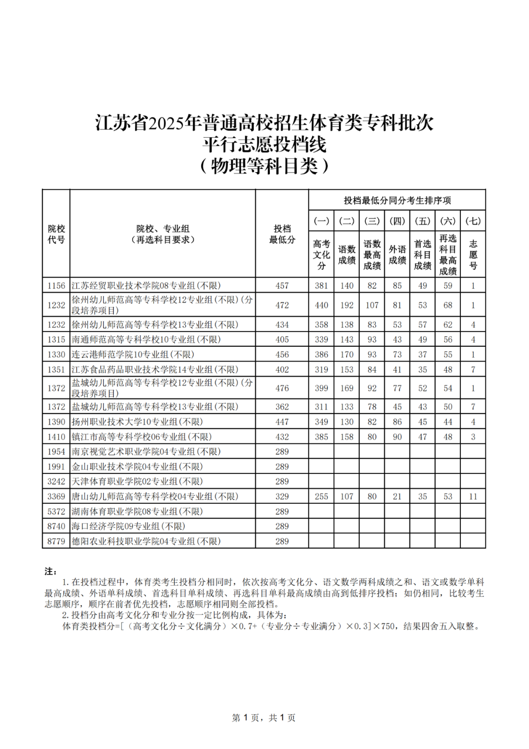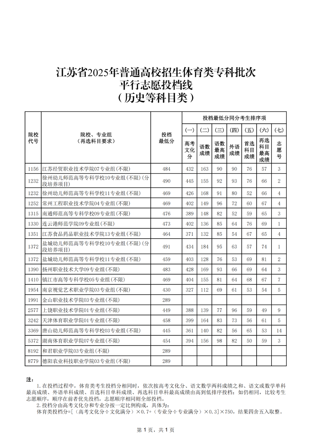 江苏省2025年普通高校招生体育类专科批次平行志愿投档线