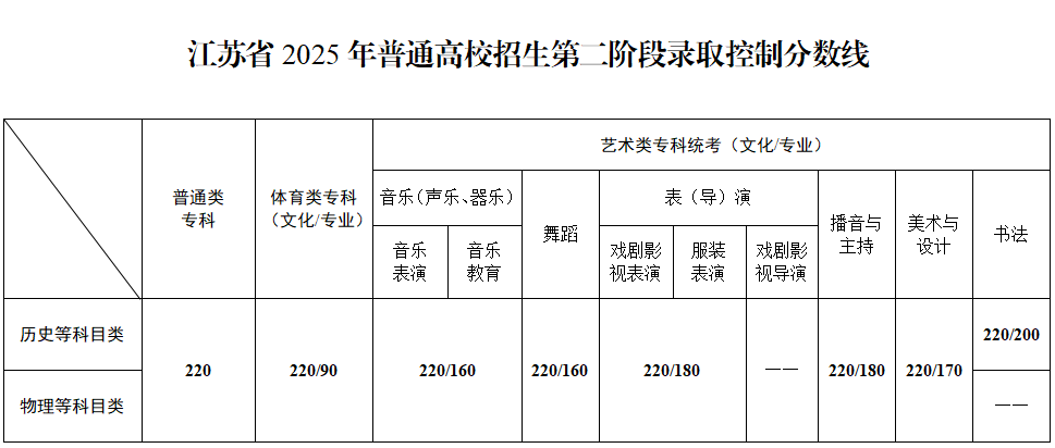 江苏省 2025年普通高校招生第二阶段录取控制分数线