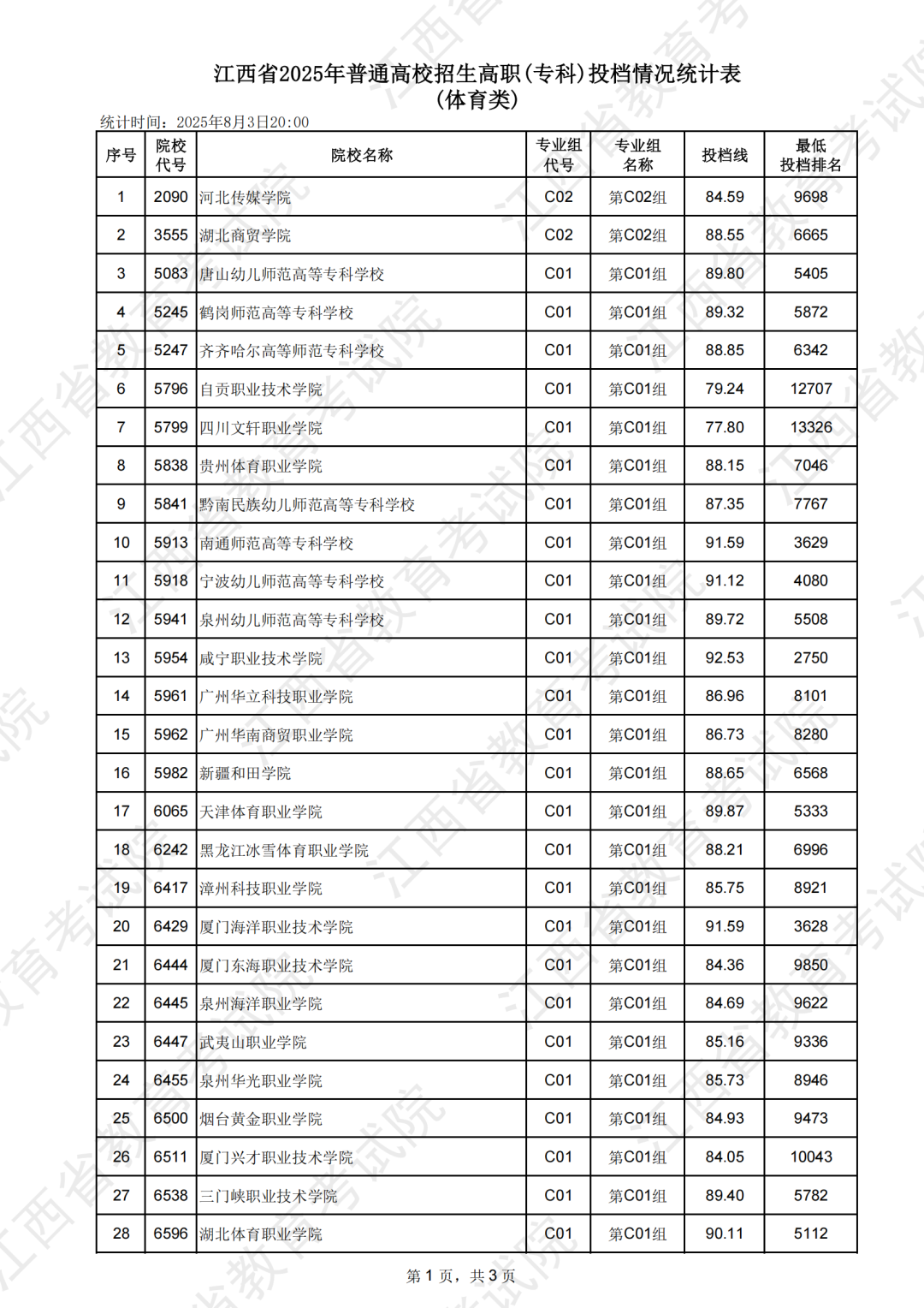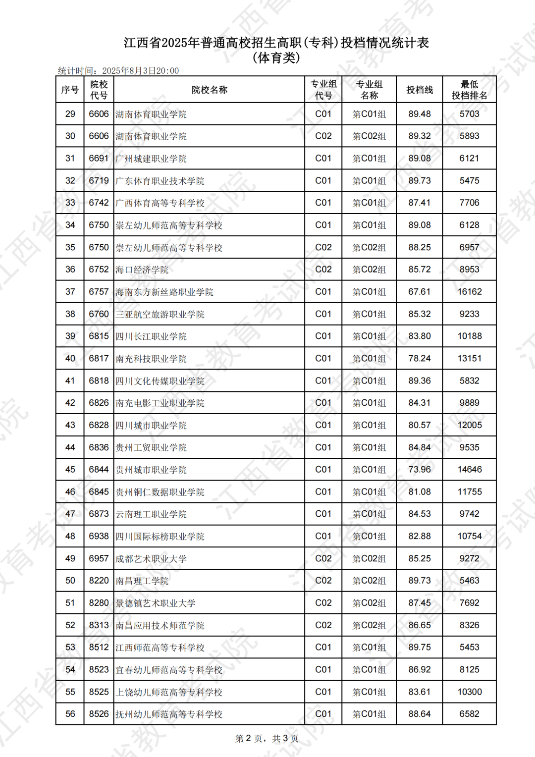 江西省2025年普通高校招生高职(专科)投档情况统计表(体育类)
