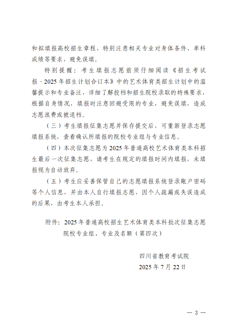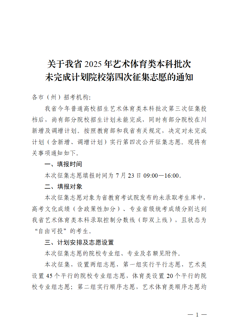 关于四川省2025年体育类本科批次未完成计划院校第四次征集志愿的通知