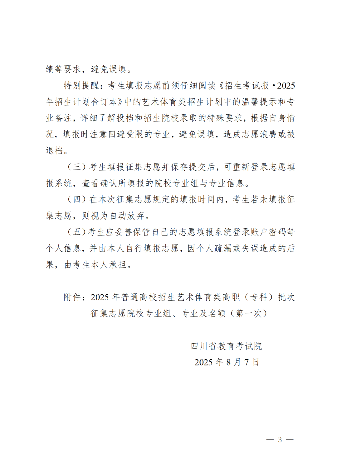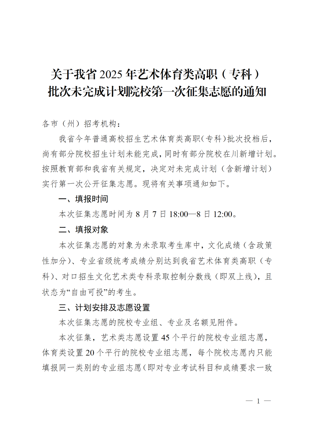 关于我省2025年艺术体育类高职(专科) 批次未完成计划院校第一次征集志愿的通知