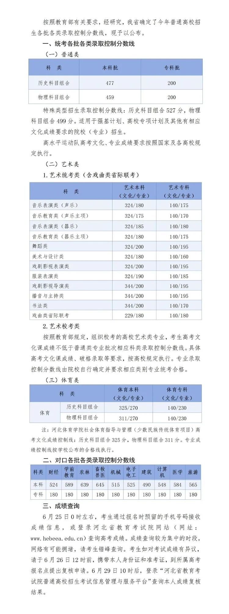 河北:2025年普通高校招生各批各类录取控制分数线