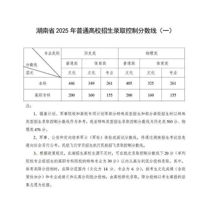 湖南:2025年普通高校招生各批次录取控制分数线公布(含体育类)