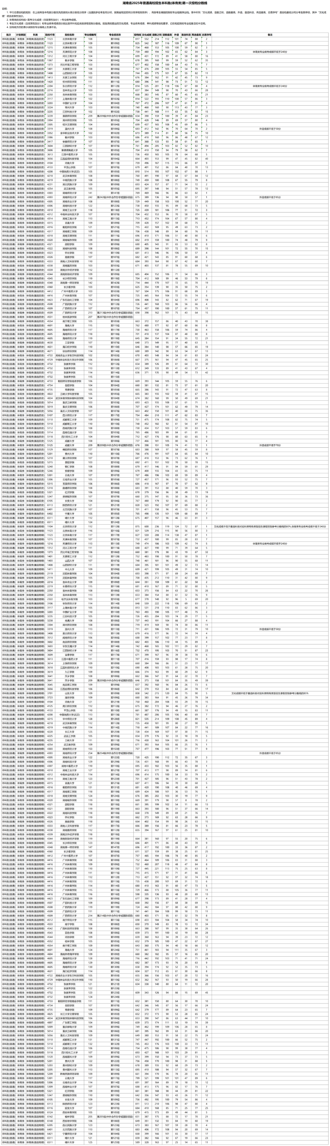 湖南省2025年普通高校招生本科批(体育类)第一次投档分数线